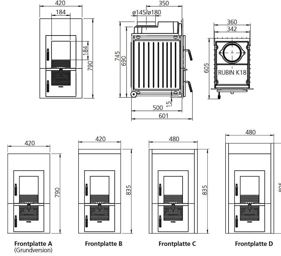 Der Kachelofeneinsatz Rubin K18 ist mit 2 verschiedenen Nennwärmeleistungsstufen und Rauchrohrstutzendurchmessern sowie Anbauleisten für 4 verschiedene Frontplattengrößen zur Auswahl bei Kaminprofi24 erhältlich.